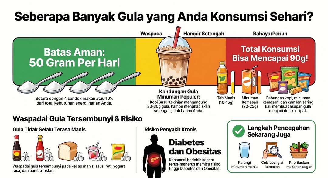 Batas ini sebenarnya cukup kecil jika dibandingkan dengan pola konsumsi saat ini. Tanpa disadari, asupan gula bisa cepat terakumulasi dari berbagai sumber dalam satu hari.