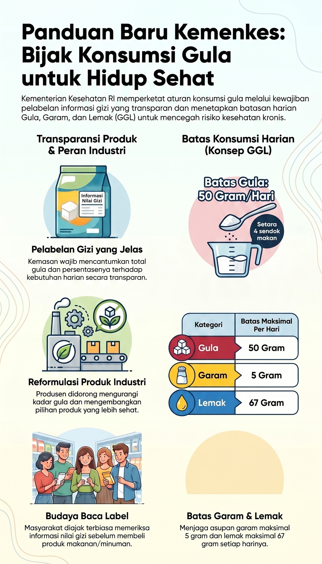 Menteri Kesehatan Budi Gunadi Sadikin menyampaikan bahwa kebijakan ini bertujuan sebagai langkah edukasi untuk menekan konsumsi berlebih gula, garam, dan lemak (GGL) yang selama ini berkontribusi terhadap meningkatnya risiko penyakit tidak menular seperti obesitas, hipertensi, penyakit jantung, stroke, hingga diabetes tipe 2.