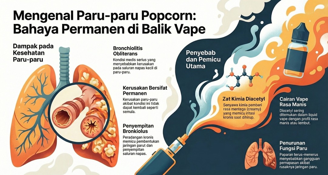 Selain risiko kanker, ada kondisi lain yang mulai banyak dibahas, yaitu Paru-paru Popcorn. Secara medis dikenal sebagai Bronchiolitis Obliterans, kondisi ini menyebabkan kerusakan pada saluran napas kecil di paru-paru.