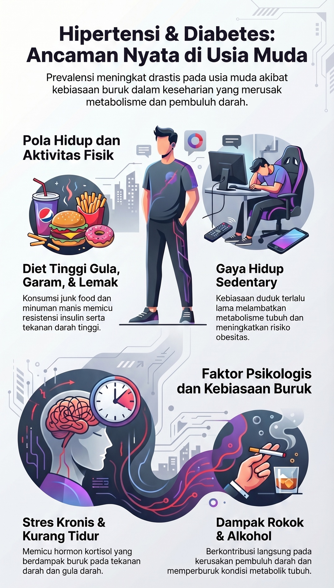 Perubahan gaya hidup modern menjadi salah satu penyebab utama. Pola makan tidak sehat, kurang aktivitas fisik, hingga stres berkepanjangan membuat penyakit tidak menular (PTM) ini semakin banyak menyerang usia produktif.
