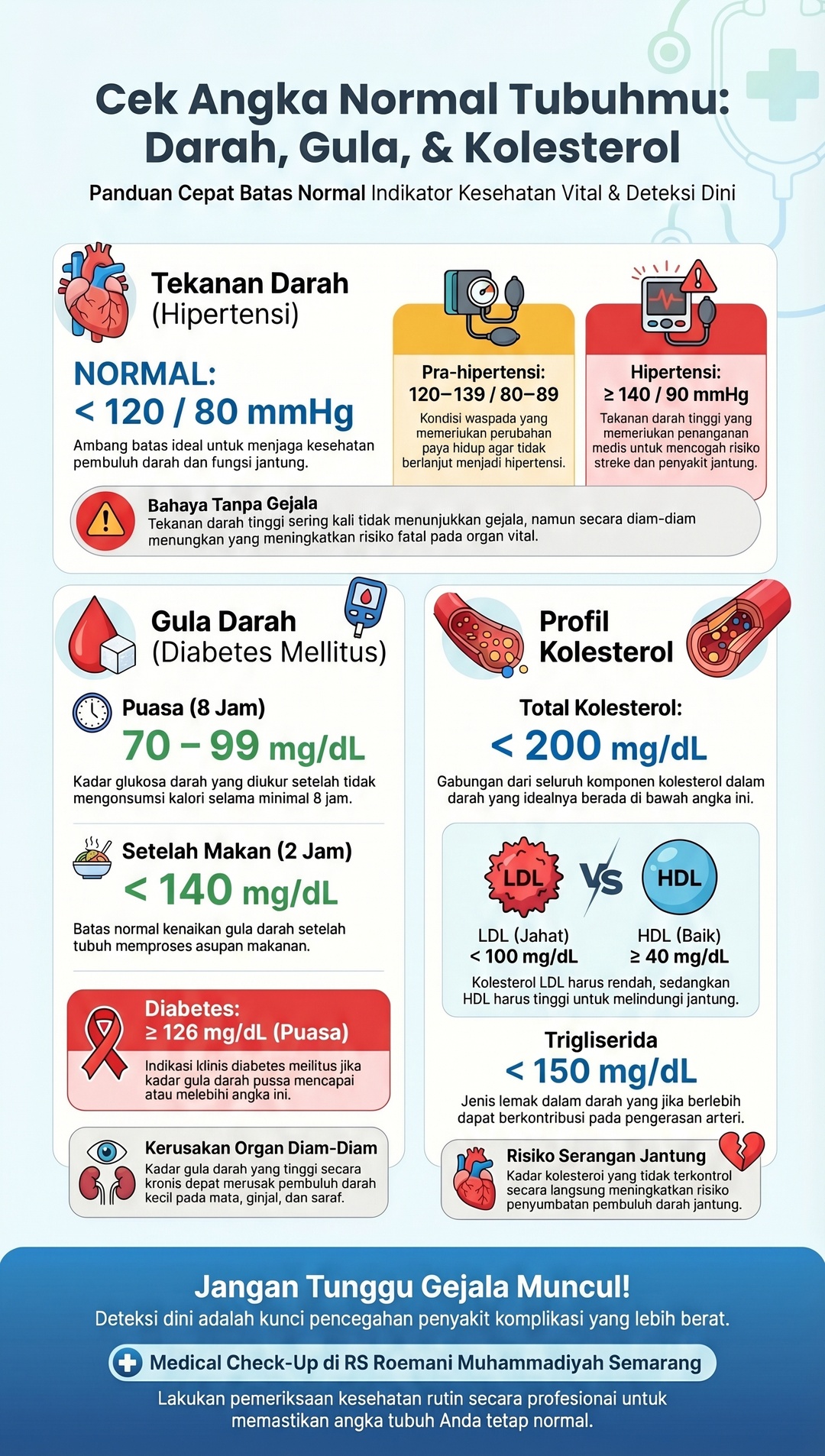 Pemeriksaan sederhana seperti cek tekanan darah, gula darah, dan profil lipid bisa menjadi langkah awal menjaga kesehatan jangka panjang.